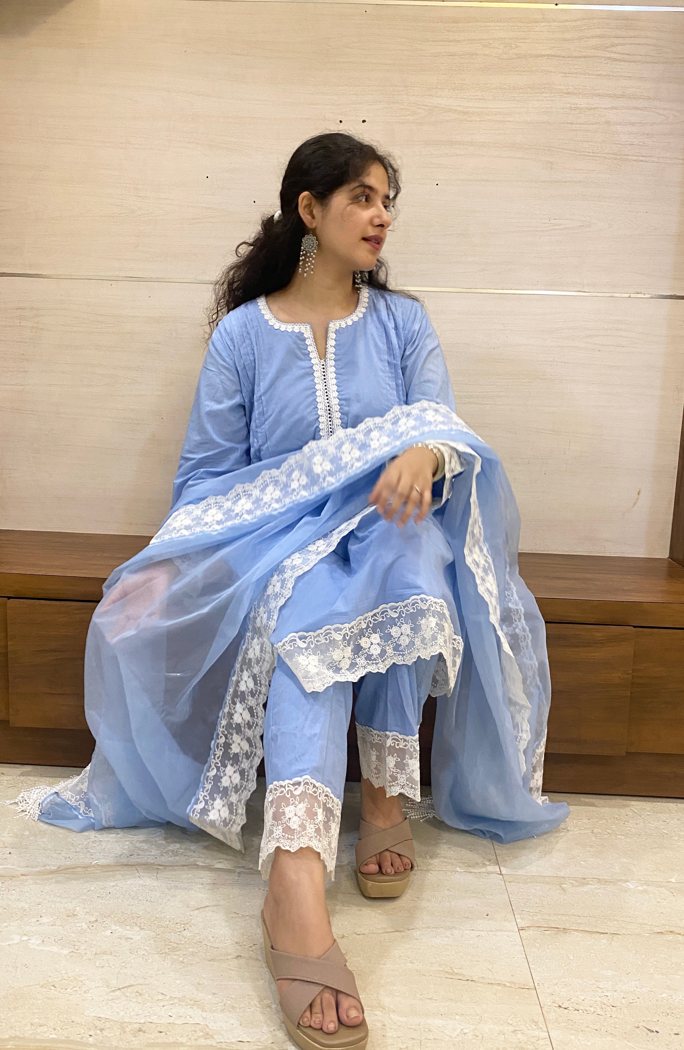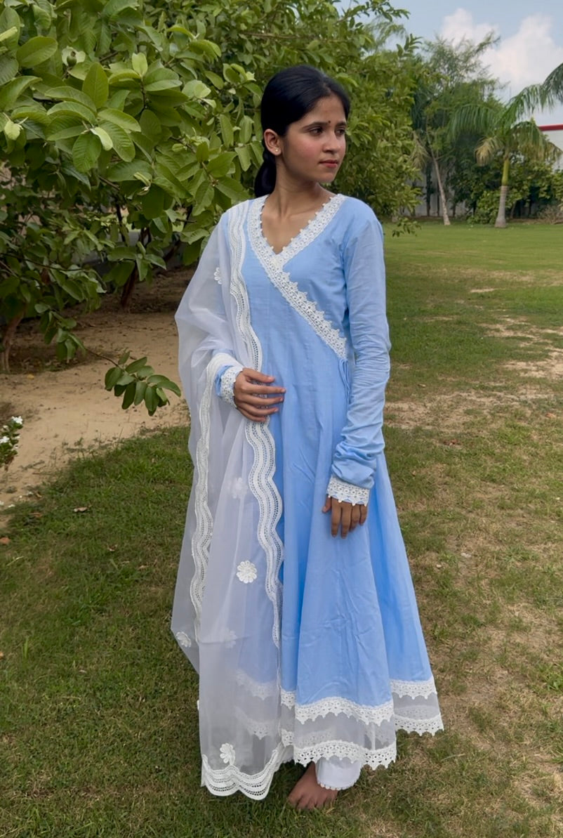 Powder Blue Cottan Angrakha Anarkali Kurta Set