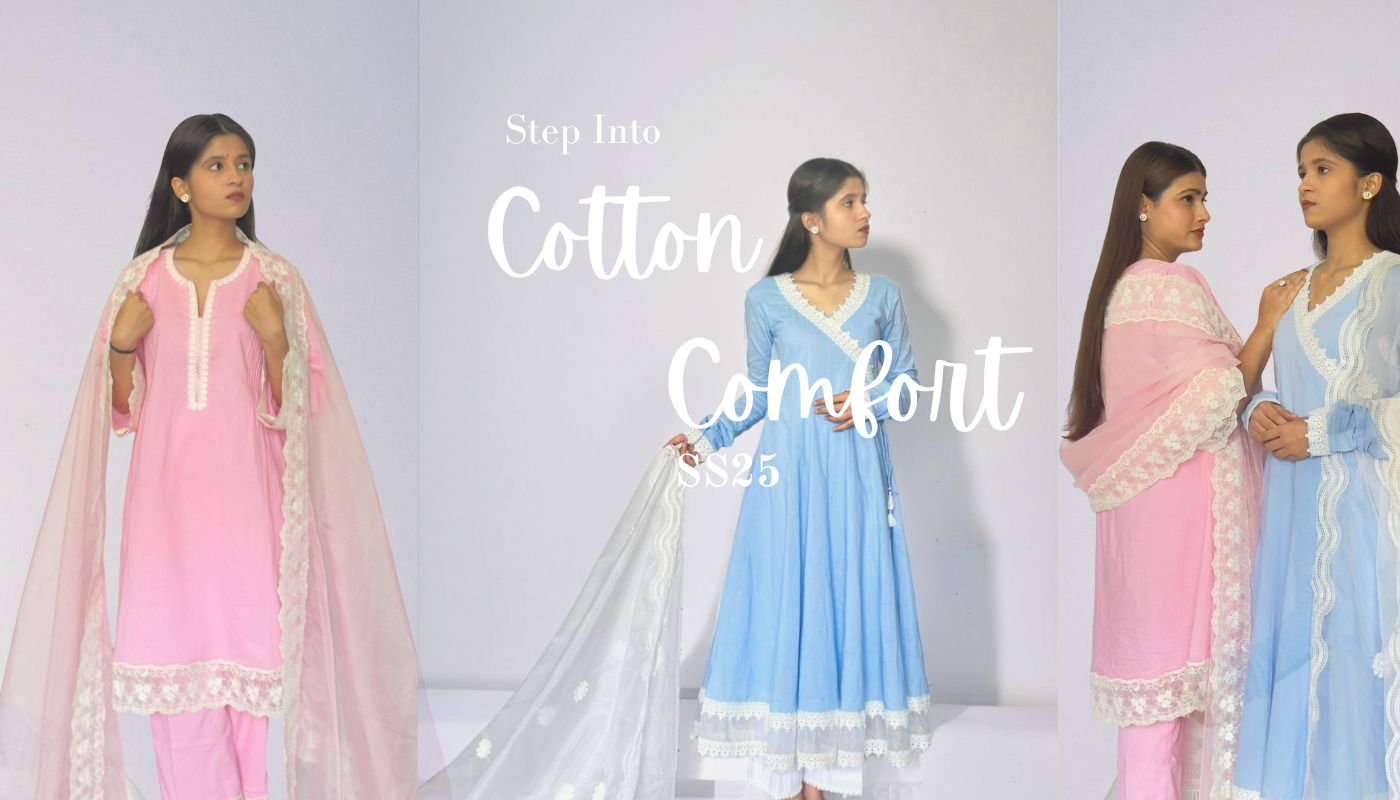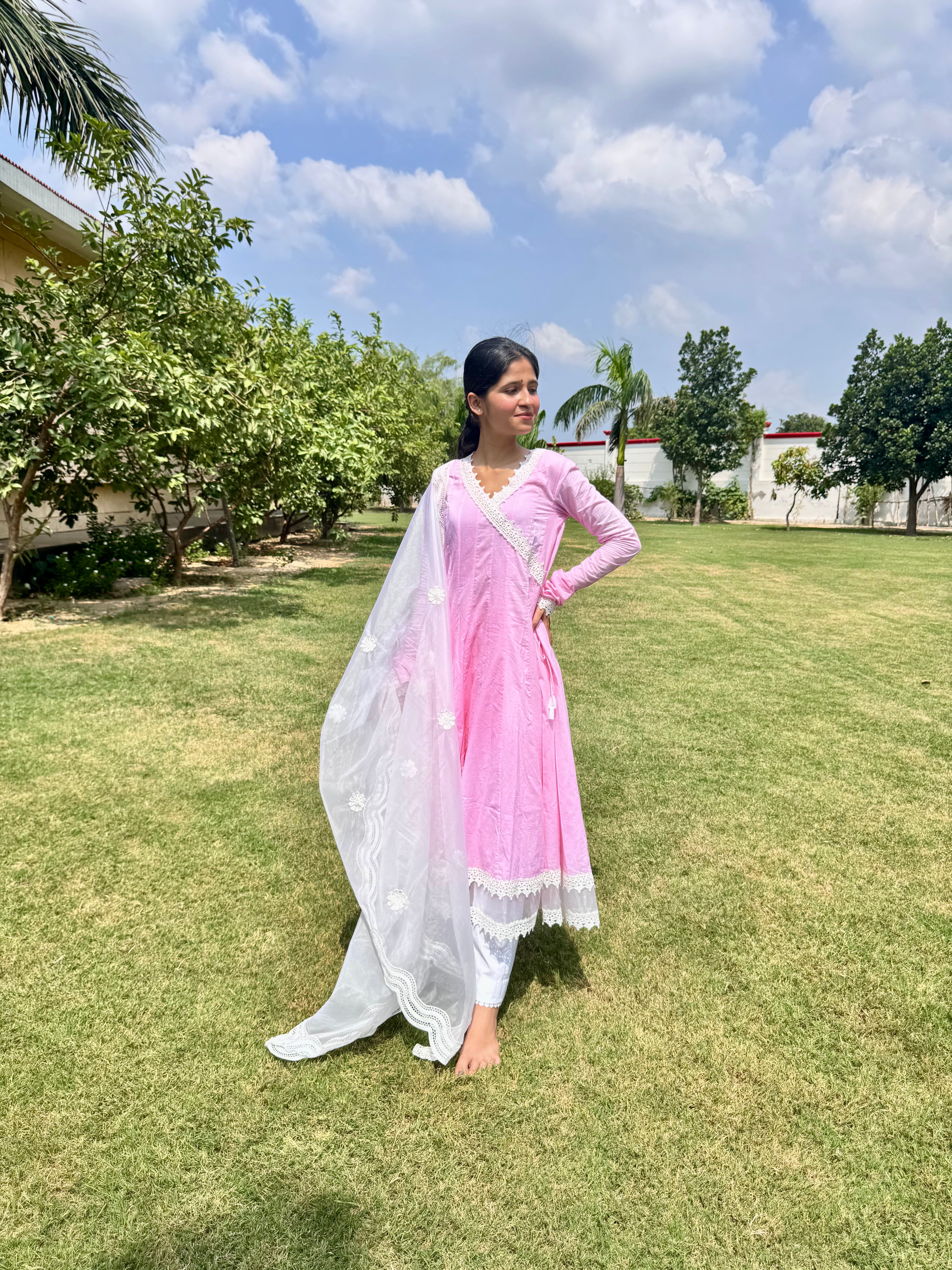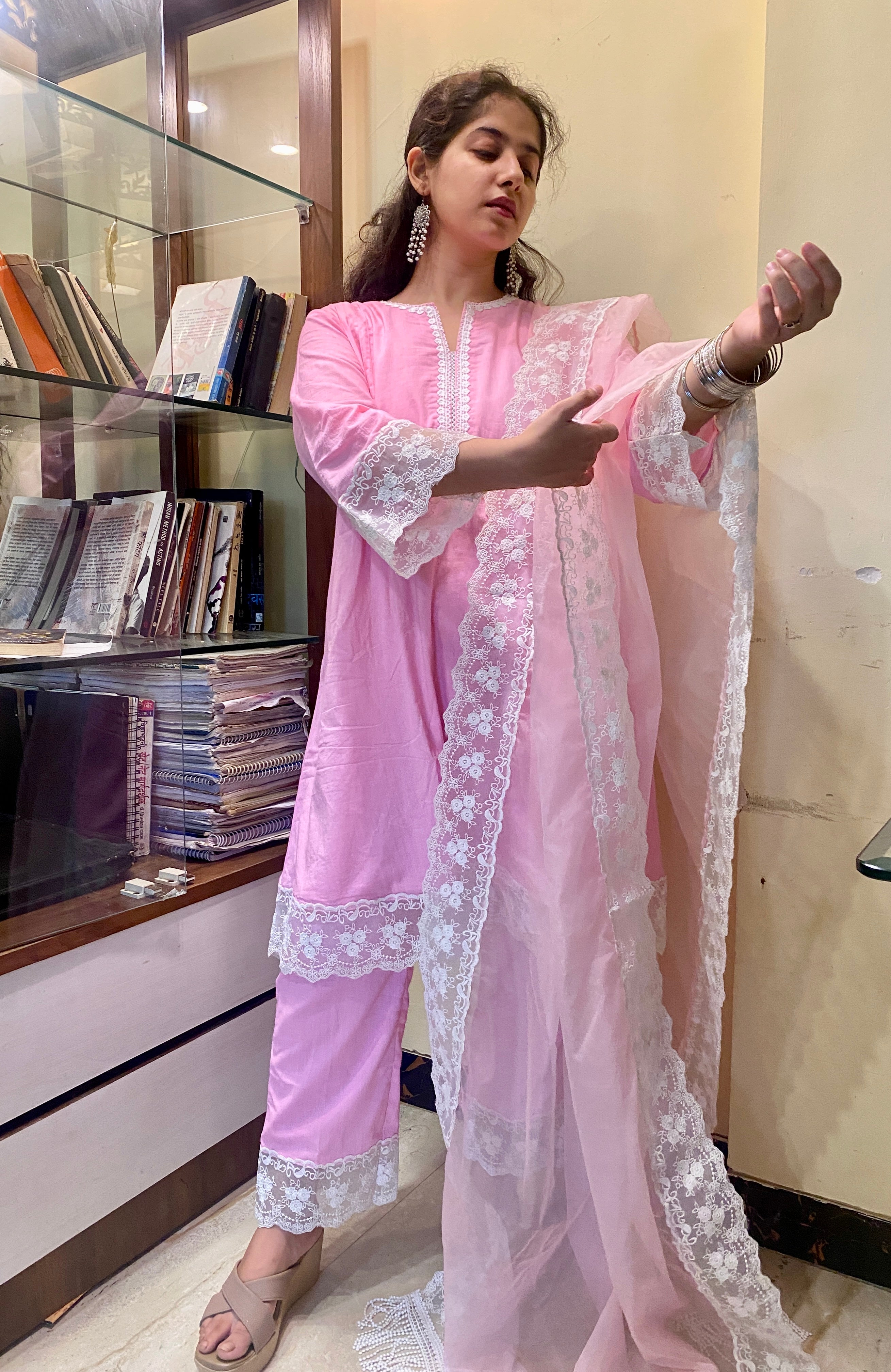 A graceful breathable cotton, this pink bell-sleeve straight kurta with soft malmal lining and delicate lace work, paired with white malmal-lined cotton pants. Finished with a lightweight pink malmal dupatta for an elegant, airy look.